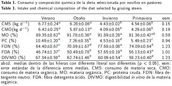 Resultados similares a los registrados en este estudio en consumo de MS y MO de la dieta de bovinos en pastoreo a través del año se han reportado anteriormente (Sowell et al. 2003). Los altos consumos de MS (6.77 kg d-1) y MO (6.42 kg d-1) observados en bovinos en pastoreo durante el verano en comparación con el invierno (4.43 y 4.09 kg d-1, respectivamente), se deben principalmente al mayor contenido de proteína y la disminución de la fracción de la fibra del forraje en esta estación del año (Bowman et al. 1999).