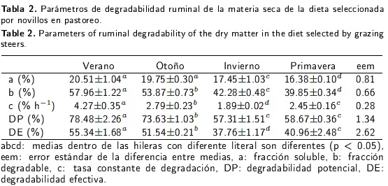 No se observaron diferencias en la fracción soluble "a" de la MS en verano (20.51 %) y otoño (19.75 %; p > 0.05); ambas estaciones del año fueron diferentes al invierno (17.45 %) y primavera (16.38 %; p < 0.05). La fracción degradable "b" de la MS fue afectada por las estaciones del año (p < 0.05); se registró el valor más alto en verano (57.96 %) y el más bajo en primavera (39.85 %). También la tasa de degradación "c" de la MS de la dieta varió con las estaciones del año (p < 0.05); obteniéndose la tasa más rápida en verano (4.27 % h-1) y la más lenta en invierno (1.89 % h-1). La degradabilidad potencial (DP) de la MS de la dieta consumida más alta se registró en verano (78.48 %) y la más baja en invierno (57.31 %; p < 0.05); mientras que la degradabilidad efectiva (DE) de la MS fue diferente entre estaciones del año (p < 0.05; Tabla 2).