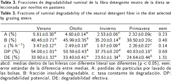 Las pérdidas de FDN por lavado (fracción "a") en verano (5.61 %) y otoño (4.60 %) fueron iguales (p > 0.05); pero fueron diferentes a las observadas en invierno (2.53 %) y primavera (2.32 %; p < 0.05). La fracción degradable "b" y la tasa degradación "c" de la FDN de la dieta consumida por los animales fueron afectadas por las estaciones del año (p < 0.05). También la DP de la FDN fue diferente entre estaciones del año (p < 0.05); registrándose los valores más altos en verano (54.08 %) y los más bajos en invierno (37.75 %). Los valores de la DE de la FDN más altos se obtuvieron en verano (33.90 %) y otoño (33.40 %) y los más bajos en invierno (23.61 %) y primavera (24.6 %) (p < 0.05; Tabla 3).