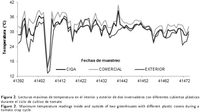 También se observaron diferencias entre la temperatura al interior de los invernaderos, siendo de 36.4 °C, la temperatura más alta que se presentó en el invernadero con la cubierta plástica modicada y de 40.8 °C el invernadero con la cubierta plástica convencional, mientras que en el exterior la máxima temperatura encontrada fue de 36.4 °C, estos valores se presentaron alrededor de las 12 a las de la tarde. En general la diferencia de temperatura al interior de los invernaderos fue de aproximadamente 2 °C, y al comparar los datos de radiación y temperatura al interior de los invernaderos, se pudo observar que la radiación transmitida por el plástico se encuentra directamente relacionada con la temperatura al interior del invernadero.