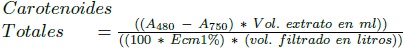 Para la determinar la concentración de carotenoides totales la alícuota del filtrado anterior se leyó a 480 y 750 nm, y después los datos se ingresaron a la siguiente fórmula:
