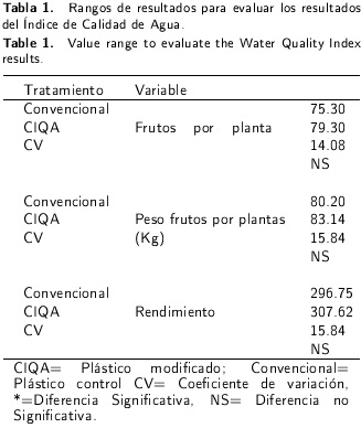 Para la variable componente de rendimiento no se encontraron diferencias (Tukey p ≤ 0.05) en ninguno de los parámetros evaluados (Tabla 1. Componente de rendimiento de un cultivo de tomate crecido bajo diferentes cubiertas plásticas) sin embargo, se puede apreciar que las plantas desarrolladas bajo el plástico modificado produjeron aproximadamente 5 % más frutos que las plantas crecidas en el invernadero cubierto con el plástico convencional, también se observo que el rendimiento en el invernadero con la película modificada presentó un incremento del 3 % en el peso de los frutos por planta, lo que permitió una diferencia numérica de 3.5 % en el rendimiento.