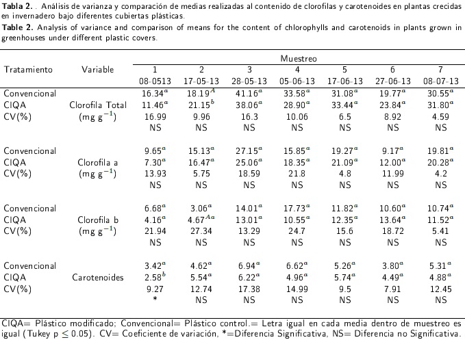 De acuerdo al análisis de varianza realizado, se encontró que el contenido de clorofila total, clorofila a y clorofila b, no mostraron diferencias entre las plantas crecidas en los diferentes invernaderos (Tabla 2. Análisis de varianza y comparación de medias realizadas al contenido de clorofilas y carotenoides en plantas crecidas en invernadero bajo diferentes cubiertas plásticas.), sin embargo, durante los muestreos realizados se presentaron fluctuaciones de sus contenidos, el contenido de clorofila total se encontró entre 16.34 y 33.58 mg g-1 para las plantas crecidas bajo el plástico convencional y entre 11.46 y 38.06 mg g-1 para las plantas crecidas bajo la cubierta CIQA, mientras que los contenidos de clorofila a fueron más altos que los de clorofila b, en las concentraciones de clorofila a se presentaron valores de 9.65 a 19.27 mg g-1 y de 7.30 a 25.06 mg g-1, las concentraciones de clorofila b fueron de 6.68 a 17.73 mg g-1 y de 4.16 a 13.01 mg g-1 para las plantas bajo la cubierta convencional y la cubierta modificada respectivamente.