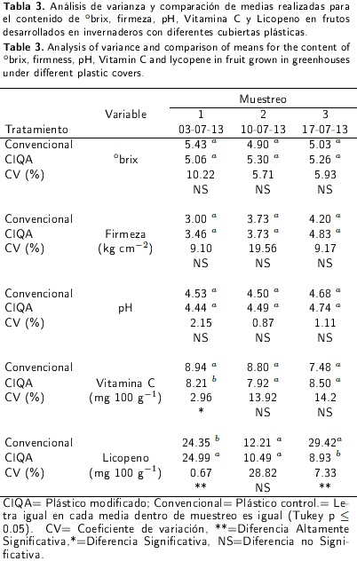 Durante los muestreos realizados en frutos de tomate crecidos bajo diferentes películas plásticas, no se encontraron diferencias en los °brix (Tabla 3. Análisis de varianza y comparación de medias no se encontraron diferencias en los °brix (Tabla 3. Análisis de varianza y comparación de medias realizadas para el contenido de °brix, firmeza, pH,Vitamina C y licopeno en frutos desarrollados en invernaderos con diferentes cubiertas plásticas), los valores para esta variable se encontraron entre 4.90 y 5.43 % para el invernadero convencional y para la cubierta plástica modificada entre 5.3 y 5.06 %. En la firmeza del fruto tampoco se encontraron diferencias entre las plantas cultivadas bajo la cubierta convencional y la modificada, los rangos oscilaron de 3.0 a 4.20 y de 3.46 a 4.83 kg cm-2 respectivamente. Tampoco se presentaron diferencias en el pH de los frutos, esta variable se mantuvo entre 4.53 y 4.68 para la cubierta convencional y entre 4.44 y 4.74 para la cubierta modificada. Por otro lado, el contenido de Vitamina C en los frutos de tomate presentó una diferencia significativa durante la primer fecha de muestreo, los frutos crecidos bajo el plástico convencional tuvieron un valor de 8.94 mg 100 g-1 y aquellos desarrollados en el plástico modificado lograron 8.21 mg 100 g-1. Para las siguientes fechas no se presentaron diferencias encontraron entre 7.48 y 8.94 mg(100 g)-1 para las plantas crecidas bajo la cubierta comercial y entre 7.92 y 8.50 mg(100 g)-1 de Vitamina C) para las plantas crecidas bajo la cubierta modificada.