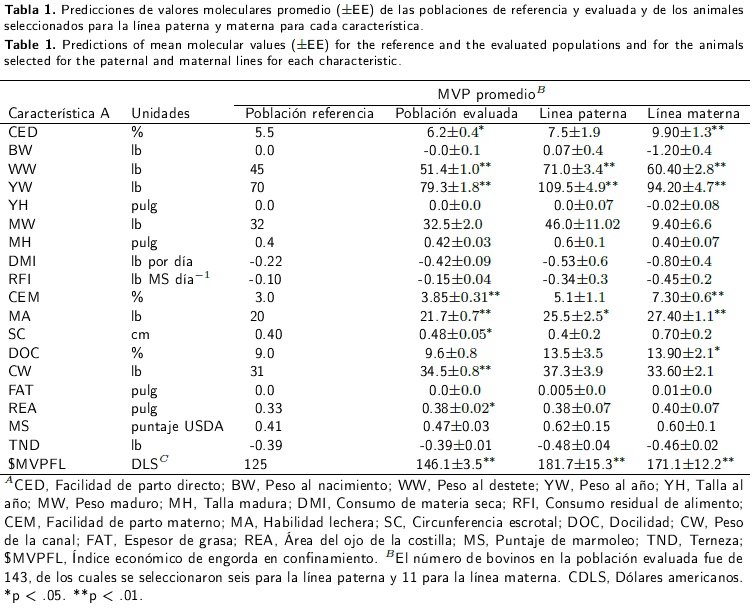 La precisión de predicción de MVP para las características evaluadas en la población de validación usada por Pfizer fue entre 0.50 y 0.67, a excepción de DMI y RFI, para las cuales se tuvieron precisiones menores (0.30 y 0.28). Los MVP promedio para CED y CEM en la población evaluada y animales seleccionados para línea materna fueron mayores en comparación con la población de referencia (p < 0.01; Tabla 1), indicando potencial para menos asistencia al parto por distocia (Bennett y Gregory 2001). El MVP promedio para MA en la población evaluada, la línea de selección materna (p < 0.01) y la línea paterna (p < 0.05), así como para la SC en la población evaluada y DOC de la línea materna (p < 0.05) fueron superiores con respecto a la población de referencia. Esto implica una mayor habilidad potencial para producción de leche, aunque con mayores requerimientos de mantenimiento (Montaño-Bermúdez et al. 1990), potencial genético para edad a la pubertad más temprana (Vargas et al. 1998) y buena disposición al manejo (Hall et al. 2011). En el caso de las características de crecimiento, los MVP promedio para WW de los animales evaluados y seleccionados para la línea materna y paterna fueron mayores comparados con la población de referencia (p < 0.01). Los MVP promedio de YW de los animales evaluados y seleccionados para línea paterna y materna fueron superiores a la población de referencia (p < 0.01). Esto indica genética para crías con mayores pesos al destete y al año, que puede resultar en mayores ingresos económicos por la venta de becerros al destete y mayores ganancias de peso en el crecimiento de los animales (Koch et al. 2004). En la población evaluada, los MVP promedio para las características de la canal CW, REA y MS fueron más altos que en la de referencia (p < 0.05), lo que implica potencial genético para mayor cantidad de carne vendible (Koch et al. 2004) y una mejora en la jugosidad de la carne (Wheeler et al. 2010). En el caso del índice $MVPFL, los valores fueron altos y superiores en la población evaluada y animales seleccionados para la línea materna y paterna (p < 0.01), indicando un buen mérito genético combinado para ganancia de peso en animales confinados en corral, consumo de materia seca, peso de la canal, y grados de calidad de la canal. Sin embargo, este índice está diseñando con base a las condiciones del mercado de los Estados Unidos de América, por lo que debe de tomarse en cuenta sólo cuando esas condiciones apliquen. Para la línea paterna, se seleccionaron tres machos y una hembra Angus, y dos machos Angus Rojo, todos provenientes de TE. Para la línea materna, se seleccionaron ocho machos y dos hembras Angus, y una hembra Angus Rojo, de los cuales uno corresponde a IA y otro a MN, los restantes son producto de TE.