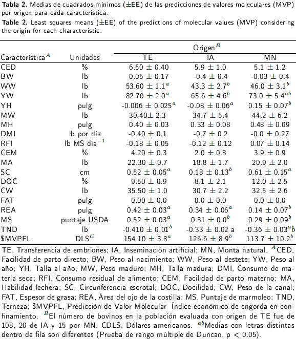 Las medias de los MVP para las diferentes características en la población evaluada y de los animales seleccionados como línea paterna y línea materna se compararon con la media de la población de referencia mediante una prueba de t de Student. Asimismo, se realizó un análisis de varianza por cada característica para los MVP de los animales evaluados en los que se incluyó el factor origen (TE, IA y MN) en el modelo ajustado con PROC GLM de SAS (versión 9.2; SAS Institute, Inc. 1999). Las medias fueron comparadas con la prueba de rango múltiple de Duncan cuando existió significancia (α = 0.05).