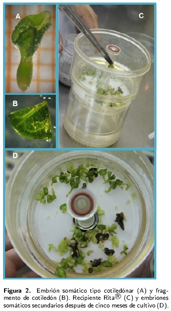 Después de los 30 d, todos los tratamientos fueron similares, mostrando escasa formación de embriones somáticos (ESO). Sin embargo, a los 120 d el tratamiento correspondiente a fragmentos de cotiledón fue estadísticamente superior al resto de los tratamientos con 26 ESO, mientras que con el tratamiento en recipiente Magenta sólo se obtuvieron ocho ESO. Al final del experimento, los cultivos en el sistema de inmersión temporal Rita® fueron estadisticamente superiores al testigo (Magenta®), en tanto que en el sitema Rita® se tuvieron 30 ESO generados con fragmentos de cotiledón y 29 ESO en cotiledones completos, produciéndose por explante en promedio tres ESO.