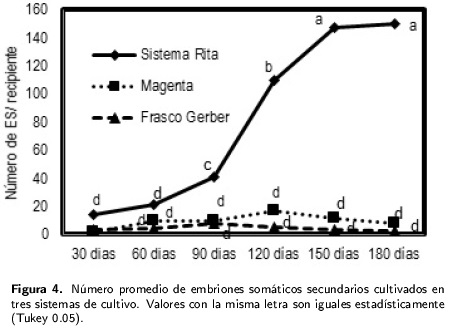 A los 30 d de cultivo se tuvieron embriones tipo globular, que se desarrollaron en el tejido superficial, apareciendo en mayor proporción en el sistema Rita® (Figura 4), con promedio de 0.84 ES a los 30 d. El mayor rendimiento de embriones somáticos secundarios se tuvo a los 180 d con promedio de 15 ES por recipiente. Este tratamiento superó estadísticamnete al testigo en frascos tipos Gerber® y a los recipientes Magenta®.