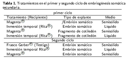 Se emplearon explantes del embrión somático tipo cotiledónar y fragmentos de cotiledón de 5mm2. Los cuales se colocaron en un medio PR confitohormonas para regenerar las plantas, desprovisto de fitohormonas. No se realizaron subcultivos durante el ciclo de cultivo. El experimento se estableció bajo un diseño experimental completamente al azar en arreglo factorial 3x2 con cinco repeticiones. Las variables estudiadas fueron el númerode embriones somáticos formados y el porcentajede oxidación. Los resultados se analizaron con un análisis de varianza y comparación de medias deTukey (0.05). Los tratamientos evaluados se presentan en la Tabla 1.