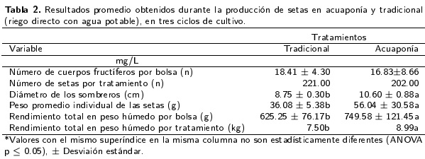 Experimento 1. La temperatura ambiente del área de producción de las setas se mantuvo entre 24.3 y 27.7 °C. Después de 40 d, los cuerpos fructíferos del sistema acuapónico alcanzaron un peso promedio de 500 g, el diámetro de sombrero y peso total de fructificación fue estadísticamente superior al observado en las setas bajo cultivo tradicional (Tabla 2).