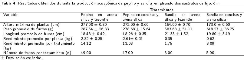 Experimento 3. Durante el cultivo de pepino y sandia, la temperatura ambiental promedio fue de 33.48 ± 1 °C, lo que causó un rápido crecimiento y producción de frutos en las dos especies. Lo anterior pudo deberse a que las raíces permanecieron inundadas en un flujo continuo de agua del sistema acuícola, lo que favoreció su desarrollo, dando como resultado una reducción del 50 % del periodo con respecto al cultivo tradicional, que oscila entre 75 y 90 d (García-Ulloa et al. 2005). Lo que puede deverse de las altas concentraciones de amonio no ionizado (NH3-N), biodisponible en el agua. Al respecto, Rakocy et al. (2006) sugieren que el número de plantas que se pueden cultivar en acuaponía está relacionado con la biomasa acuícola y la tasa de alimentación durante el cultivo, lo que puede variar con el desempeño de la especie acuática. Al respecto Van Gorder (1991) indica que una elevada concentración de amonio en el agua de riego puede afectar el crecimiento de las plantas, así como la formación y maduración de frutos, por lo que es fundamental que el agua proveniente del sistema acuícola pase primero por un filtro biológico, en donde se transformen los metabolitos a productos que se puedan aprovechar por las plantas (Rakocy et al 2006). Con respecto a los sustratos de fijación probados, es importante destacar que la causa de evaluar el desempeño de la concha como sustrato es su disponibilidad local (Ronzón-Ortega et al 2012, Pérez-Rostro et al 2013). De acuerdo los resultados, la concha mantuvo su estructura al final del estudio, con la ventaja adicional de que en dicho sustrato no crecieron plantas que compitieran con las cucurbitáceas, como puede ocurrir al usar tezontle.