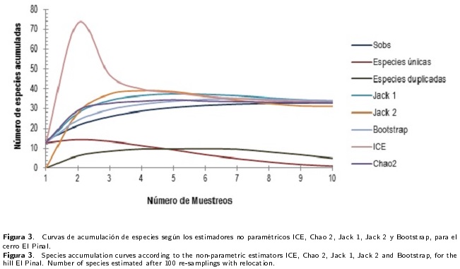 Para estimar la riqueza observada y la com-pletitud del inventario de especies de hongos silvestres comestibles del cerro El Piñal se ejecutó un análisis combinado de estimadores no paramétricos para esfuerzos de muestreo crecientes, debido a que es la forma más directa de inferir la biodiversidad de un sitio (Dale y Beyeler 2001, Sarkar 2002, Magurran 2004, González-Oreja et al. 2010b). Se calcularon curvas de acumulación de especies estimadas según los estimadores no paramétricos (Chazdon et al. 1998, Colwell 2006) de cobertura, basado en la incidencia (ICE), estimador Chao 2, estimadores de Jackknife de primer y segundo orden (Jack 1 y Jack 2) y estimador Bootsrap. Se eliminó el posible efecto del orden en el que se añaden las muestras a la curva mediante remuestreo aleatorio, en todos los cálculos se usaron 100 aleatorizaciones con reemplazamiento (Colwell y Coddington 1994). Todas las estimaciones se realizaron con el programa EstimateS vers. 9.1.0 (Colwell 2006); los resultados de todas las reordenaciones aleatorias se exportaron a un archivo de Microsoft Office Excel para evaluar los resultados de cada estimador. La estructura del modelo de acumulación de especies asintótico utilizado fue el de Chapman-Richards: