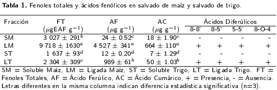 Ácidos fenólicos solubles y ligados, fueron obtenidos de salvado de maíz y trigo, en los que se determinaron los niveles de fenoles totales (Folin-Ciocalteu), ácidos fenólicos (HPLC), actividad antioxidante (DPPH, ORAC) y presencia de ácidos diferúlicos (espectros UV). Las concentraciones de fenoles totales, ácido ferúlico y ácido cumárico fueron de 1 637 a 9 718 µg EAF g-1, de 12 a 4 527 µg g-1 y de 7 a 664 µg g-1, mientras que la actividad antioxidante fue de 9.52 a 64.14 % de inhibición de DPPH y de 11.46 a 67.09 µmol ET g-1 en ORAC. Se identificó la presencia de los ácidos diferúlicos 8-8’, 8-5’, 5-5’ y 8-0-4’ en las fracciones ligadas. Todas las fracciones presentaron niveles importantes de fenoles totales, ácidos fenólicos y actividad antioxidante, siendo la fracción ligada de salvado de maíz la que presentó las mayores concentraciones.