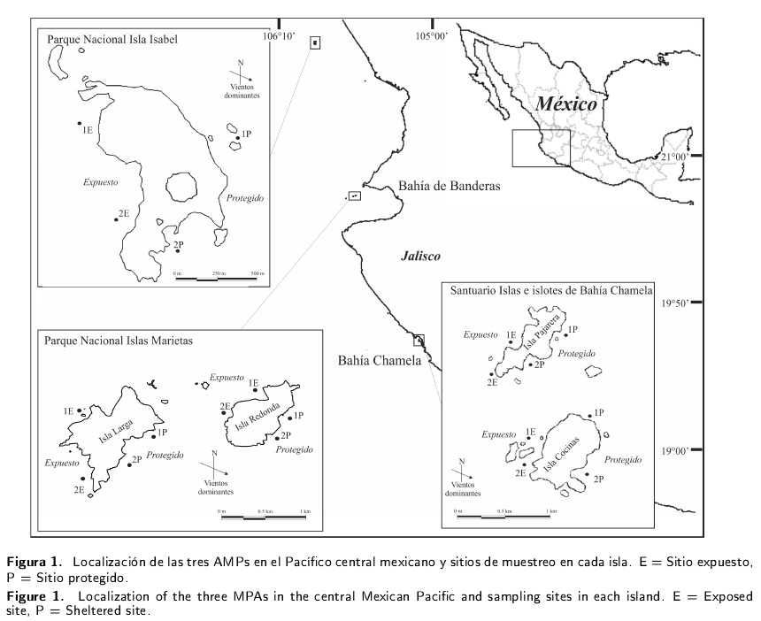 A E. Ríos, F. Rodríguez, C. González y J. Tovar por sus comentarios y sugerencias a la primera versión del escrito. A J. Castrejón, G. Lozano, C. Robles (CONANP-San Blas) por su apoyo en las salidas a la isla Isabel. Al personal de Vallartech (Pto.Vallarta) por su ayuda en las salidas a islas Marietas y a J. Vega, jefe de la estación de Biología Chamela (IBUNAM), por las facilidades otorgadas durante los muéstreos en Bahía Chamela. Los fondos para este trabajo fueron otorgados por la Universidad de Guadalajara (Proyecto P3E-2009), la CONABIO (Proyecto BK018) y la beca de posgrado de CONACYT-México (No. 241329).
