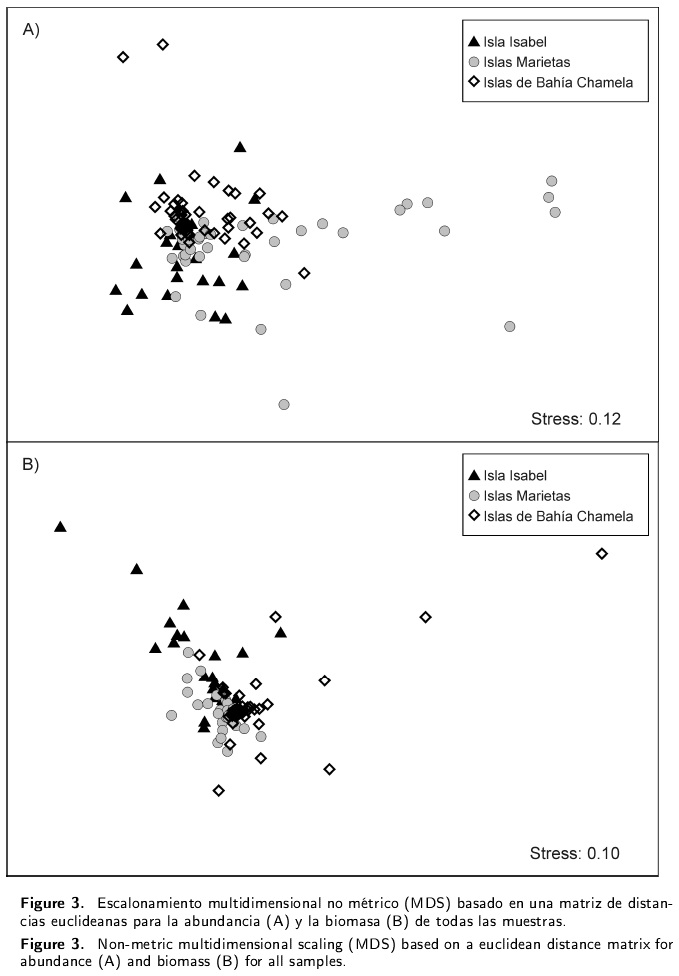 Los resultados indican que en cada uno de los sistemas insulares influyen distintos elementos estructurales del hábitat lo cual se refleja en la composición de las especies de peces residentes de cada uno de ellos. Además, el uso de tres índices estructurales (riqueza, abundancia y biomasa) permitió tener una descripción detallada de la comunidad ictiológica de cada sitio, resaltando especies de interés científico y con potencial comercial para la región. Finalmente, se resalta que Isla Isabel presenta mayor riqueza de especies y biomasa, lo que puede ser debido a la complejidad estructural de sus arrecifes y la distancia que la separa de la costa. Esta separación le permite soportar una gran cantidad de peces de tallas grandes, como lo proponen Thomson y Gilligan (1983) para las islas del Golfo de California.