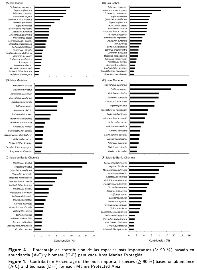 Mediante los análisis SIMPER se encontraron diferencias en las especies que más contribuyen a la abundancia y biomasa de peces en cada una de las AMPs (Figura 4). En la Isla Isabel, el 90.73 % de la abundancia estuvo representado por 23 especies, de éstas la más importante fue T. lucasanum (9.55 %). El 90.23 % de la biomasa de esta isla se obtuvo también con 23 especies, pero la más importante fue P. punctatus (13.82 %). En Marietas, 17 especies contribuyeron con más del 90 % de la abundancia y biomasa. En el caso de la abundancia, la especie más importante fue H. dispilus (15.97 %) y de la biomasa E. labriformis (15.32 %). En Bahía Chamela, 90.39 % de la abundancia estuvo representada por 19 especies y 91.16 % de la biomasa por 20. Al igual que en Islas Marietas, la especie que más aporto a la abundancia fue H. dispilus (14.19 %) y a la biomasa E. labriformis (12.24 %).