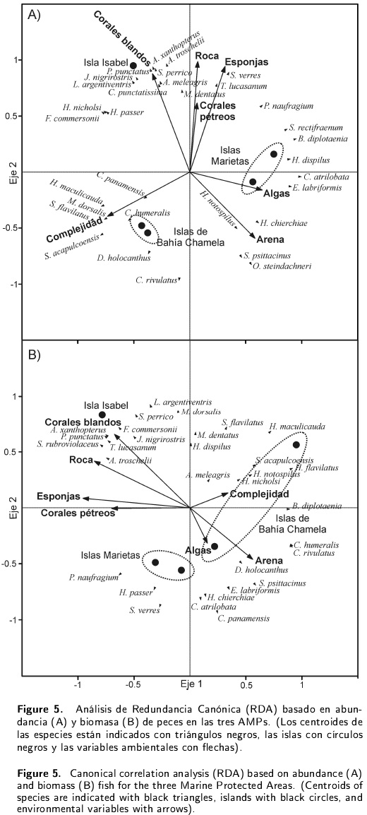 Con los valores de biomasa se encontraron correlaciones significativas sólo con la cobertura de esponjas y los corales blandos (p < 0.05). En Isla Isabel se encontraron correlaciones significativas entre la cobertura de corales blandos, roca y esponjas con las especies A. xanthopterus, P. punctatus, S. rubrioviolaceus, L. argentiventris, M. dorsalis, S. perrico, F. commersonii, J. nigrirostris, T. lucasanum y A. troschelii. En Islas Marietas, la cobertura de algas con la biomasa de P. naufragium, H. passer y S. verres. En Bahía Chamela, las correlaciones significativas fueron distintas en las dos islas: en Pajarera entre la complejidad topográfica y la biomasa de H. nicholsi, H. notospilus, H. flavilatus, S. acapulcoensis, A. meleagris y H. maculicauda; y en Cocinas lo fueron algas y arena con la biomasa de C. humeralis, C. rivulatus, D. holocanthus, S. psittacinus, E. labriformis, H. chierchiae, C. atrilobata y C. panamensis (Figura 5B).