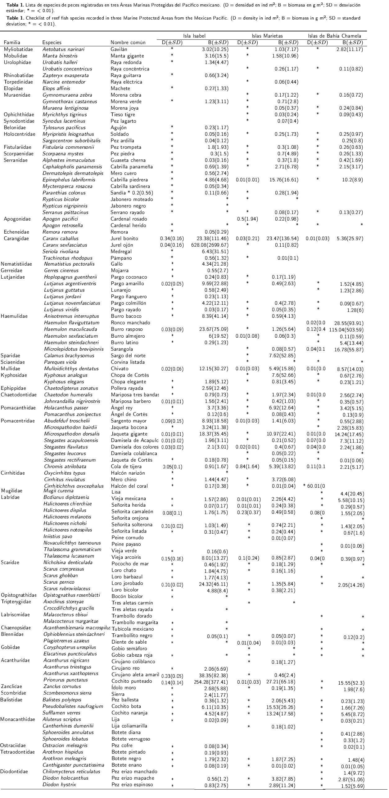 Para las tres AMPs las familias con el mayor número de especies fueron Labridae (10 spp.), Pomacentridae (8), Serranidae (7), Lutjanidae (6), Haemulidae (6) y Scaridae (5). Las especies más abundantes (> 1 000 organismos) fueron Chromis atrilobata (31.18 %), Apogon pacificus (16.09 %), Halichoeres dispilus (11.53 %), Thalassoma lucasanum (7.16 %), Haemulon maculicauda (4.48 %), Stegastes flavilatus (2.89 %), Prionurus punctatus (2.82 %) y Stegastes acapulcoensis (2.71 %). Para Isla Isabel se estimó una biomasa de 27.43 kg m-2, para las Islas Marietas de 8.03 Kg m-2 para las islas de Bahía Chamela de 15.23 kg m-2. Las especies con mayor biomasa fueron Caranx sexfasciatus (29.74 %), P. punctatus (16.08 %), H. maculicauda (12.13 %), Caranx caballus (3.84 %), Microspathodon dorsalis (3.26 %), Haemulon flaviguttatum (2.70 %) y Epinephelus labriformis (2.69 %); y en conjunto estas especies representaron 70 % de la biomasa total estimada en todo el estudio (N = 50.7 kg m-2) (Tabla 1).