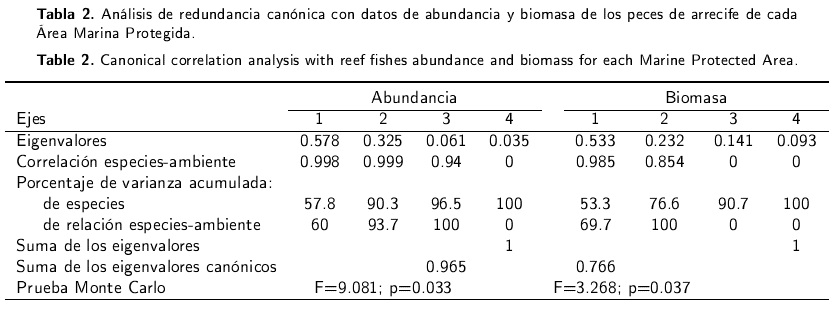 La correlación entre la abundancia y biomasa de los peces con los elementos estructurales del fondo se evaluó mediante un análisis de redundancia canónica (RDA) con el programa CANOCO v4.5 (ter Braak y Smilauer 2002). Se utilizó este método multivariado siguiendo el criterio de longitud del gradiente, con un modelo de respuesta de las especies al ambiente de tipo lineal. Cada RDA se realizó usando sólo las especies con mayor contribución a la abundancia y biomasa de cada AMP, determinadas previamente por los análisis SIMPER. Los valores de abundancia y biomasa fueron transformados mediante distancias de Hellinger (Rao 1995) y la significancia estadística fue probada mediante permutaciones Monte Cario (n = 9 999). La significancia estadística de las variables ambientales entre AMPs se probó mediante un análisis de varianza de una vía (ANOVA) con el programa Statgraphics vl5; previamente se comprobó la normalidad y homocedasticidad de los datos mediante una prueba de Levene.