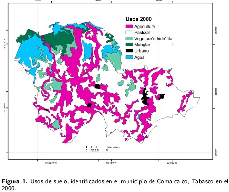 En el 2000, se identificaron seis usos de suelo: pastizales, agrícola, vegetación hidrófila, manglares,cuerpos de agua y áreas urbanas. Fisiográficamente las áreas más bajas del municipio se localizanen la parte norte; donde se hallan los usos mástolerantes a condiciones de inundación prolongada, específicamente manglares y cuerpos lagunares, enla parte noreste se distribuye una pequeña porciónde vegetación hidrófila, en tanto que uso agrícola ypastizales se ubican en menor superficie. La porcióncentral y sur es la menos diversa en cuantos usos desuelo, se restringe a pastizales, agrícola y áreas urbanas. Los usos que figuran con la mayor extensiónson el de pastizal y agrícola (Figura 1).