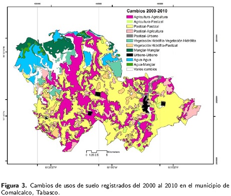 Los usos de suelo de agricultura, pastizal, vegetación hidrófita, manglar, urbano y cuerpos de agua que fueron observados en el año 2010 son idénticos a los encontrados en el 2000. Del 2000 al 2010, se observó una reconfiguración del uso de suelo, debido al crecimiento del uso agrícola, urbano y manglares; así como una reducción de la superficie de pastizales y vegetación hidrófita. En la parte norte del municipio de Comalcalco se encontraron cuerpos lagunares y manglares, los cuales se ubicaron sobre suelos inundables; mientras que en la parte sur se distribuyen las áreas agrícolas y pastizales. Se observa un proceso de desganaderización, sustituida por un crecimiento en el uso agrícola y urbano. Se identificaron repercusiones favorables del cambio de uso de suelo y crecimiento de las áreas de manglar, así como la reducción de áreas de vegetación hidrófita que recientemente se han abierto al uso de pastizal.
