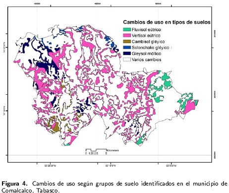 Por su amplia distribución, los Vertisoles eútricos son los suelos con más cambios de uso, ya que 15 428.96 ha (29 %) de estos suelos, han tenido cambios de uso, particularmente de tipo agrícola. Otros suelos que también presentan cambios de uso fueron son los Gleysoles mólicos de los que cambiaron de uso 3 018.52 ha, lo que equivale al 31 257% de su superficie total, seguido de los Fluvisoles eútricos cuyo cambio ocurrió en 1 856.72 ha, que equivalen al 30 % del total de la superficie.