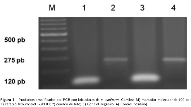 Para el diagnóstico se emplearon tres fetos de los cuales se obtuvieron 25 mg de tejido cerebral, renal e hígado fetal; se realizó la extracción del ADN con un paquete comercial (Ultra Clean, MoBioLab™ Se practicó el ensayo de PCR semianidado con secuencias iniciadoras publicadas previamente Np4 (5’CCTCCCAATGCGAACGAAA3'), Np7 (5’GGGTGAACCGAGGGAGTTG3’) y en el formato semianidado se incluyeron Np6 (5'CAGT-CAACCTACGTCTTCT3') y Np7. Por cada muestra se emplearon 43 de la mezcla comercial (PCR Master Mix, Promega™, USA), a la que se le agregaron 5 µL de ADN blanco y 1 µL de cada iniciador. El protocolo de amplificación fue de 95 °C por 2 min para pre desnaturalización; 95 °C por 30 s para desnaturalización, 57 °C por 30 s para alineamiento y 72 °C por 60 s para la extensión por 35 ciclos y la extensión final a 72 °C por 3 min. Los productos de la amplificación se separaron en un gelde agarosa al 1.8 % teñido con bromuro de etidio y se visualizaron con luz ultravioleta (UV). El tamaño esperado del amplicón fue de 275 pares de bases (pb) (Bazler et al. 1999).