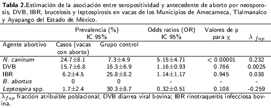 Al comparar las vacas con antecedente de aborto y el grupo control para N. caninum, DVB, IBR, brucelosis y leptospirosis, sólo se encontraron diferencias significativas para N. caninum (P =0.00001) con un OR = 5.15 (IC 95 %: 2.06, 12.86) y la fracción poblacional (λfap) de 0.232 (Tabla 2) el OR indicó que el ganado seropositivo a N. caninum y con antecedente de aborto, tuvo 5.1 veces más posibilidad de abortar que el ganado no infectado (García-Vázquez et al. 2005, González-Warleta et al. 2007). La fracción atribuible poblacional para N. caninum indicó que 23.2 % de los abortos en el ganado bajo estudio pueden ser atribuidos a este parásito, por lo que este porcentaje de abortos puede disminuir si el parásito se controla o erradica.