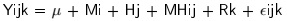 Donde, i = 1,2,. ..m (machos); j = l,2,...h(hembras); k = 1,2,...r (repeticiones); Yijk = valor observado de la cruza entre el i-ésimo macho y la j-ésima hembra en la k-ésima repetición; µ = media general; Mi y Hj = efecto del i-ésimo macho y j-ésima hembra; MHij = efecto de la interacción del i-ésimo macho con la j-ésima hembra; ∈ijk = error experimental. La estimación de los efectos de aptitud combinatoria general (ACG) para los machos y hembras, y la aptitud combinatoria específica (ACE) para las cruzas, se realizó de acuerdo con Sprague y Tatum (1942):
