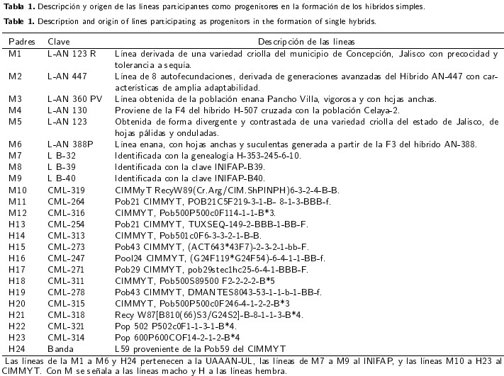 Se evaluaron 24 líneas endogámicas con un nivel de endogamia variable entre S7 y S9 (Tabla 1), de las cuales 14 provienen del Centro Internacional de Mejoramiento de Maíz y Trigo (CIM-MYT), tres del Instituto Nacional de Investigaciones Forestales, Agrícolas y Pecuarias (INIFAP) y siete del programa de mejoramiento de la Universidad Autónoma Agraria Antonio Narro - Unidad Laguna (UAAAN-UL). De las 24 líneas 12 se usaron como macho y las otras 12 como hembras, lo que generó 144 cruzas posibles; que se formaron en el ciclo primavera-verano 2006, en el campo experimental de la UAAAN-UL.