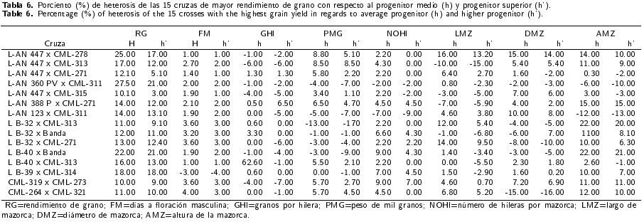 El porcentaje de heterosis con relación al progenitor medio y al superior se presenta en la Tabla 6, en la que se observa que los mayores valores de heterosis para RG con respecto al progenitor medio fueron de 22.00 (LB-40 x BANDA) a 27.5 % (L-AN 360 PV x CML-311). Mientras que las cruzas L-AN 360 PV x CML-311 y LB-40 x BANDA mostraron los mayores valores de heterosis con respecto al progenitor superior con heterosis del 21 %.