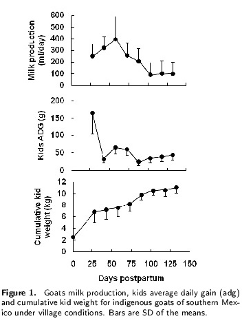 Se registró la producción de leche, el intervalo entre partos y el crecimiento de los cabritos de cabras criollas del sur de México en pastoreo en bosque tropical. La producción de leche por lactancia (108 d) fue de 26.9 ± 9.3 kg. La ganancia diaria de peso de los cabritos fue de 67 ± 27 g. La producción diaria de leche explicó que la variación de la ganancia de peso de los cabritos fuera menor a 1 %. Se concluyó que, debido a la alta inversión energética en la reproducción (intervalo entre partos de 195 ± 8 d), el bajo mérito genético para la producción de leche, su bajo peso corporal (28.7 ± 3.3 kg) y la sub-óptima nutrición (sólo 6 h diarias de pastoreo), la producción de leche de las cabras criollas del sur de México es muy pobre, lo cual obliga a sus cabritos a depender del forraje nativo a una edad muy temprana.