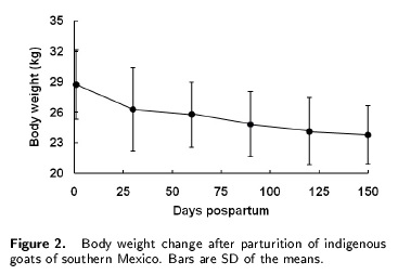 Goats lost weight throughout lactation (-3.5 kg, Figure 2), which is typical of native goats reared on pasture (Ortega-Jiménez et al. 2005). Dietary restriction of goats during lactation explain the reduced milk yield per lactation, but weight loss did not hamper early return to estrus, which is a common feature of indigenous goats under harsh conditions (Zarazaga et al. 2005; Rosales et al. 2006). For most of the lactation, kids’ growth seems to be independent of milk yield of dams, which indicates a high dependency of kids upon pasture plants from early age.