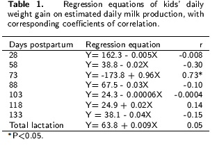 Body weight of adult goats was recorded monthly, using a platform scale weighing from 0 to 100 kg (in 100 g increments) in the morning, before goats went on pasture for herbage intake. Correlations between milk yield at different stages of lactation and kids’ daily average gain (ADG) were determined using correlation (PROC CORR procedure of SAS) and regression analysis (PROC REG).