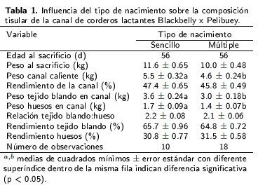 El estudio de los factores que afectan el peso y rendimiento de la composición tisular de la canal, mes importante por la posible relación del peso vivo (PV) con la cantidad de productos vendibles (Borneton et al. 2005). Otros estudios con corderos lechales de razas de lana, reportan la influencia de la raza, peso y sexo en la composición tisular de la canal y de diversos cortes primarios (Miguélez et al. 1202007, Luaces et al. 2008, Pérez et al. 2012). Sin embargo, no se ha evaluado la influencia del tipo de nacimiento, ya que se han utilizado corderos de nacimientos sencillo. En el caso de corderos jóvenes de razas de pelo, existe poca información sobre la composición tisular de la canal (Combellas 1977), donde no se considera la participación del tipo de nacimiento del cordero, factor que puede ser importante, debido a que las ovejas de pelo muestran una alta prolificidad (Macedo y Arredondo 2008). Con base en estos antecedentes, el objetivo del presente estudio fue evaluar la influencia del tipo de nacimiento de los corderos y el número de parto de la oveja sobre la composición tisular de cortes primarios y de la canal. También, se determinó la relación de la composición tisular de los cortes primarios con el peso y rendimiento de tejido blando y hueso en la canal.