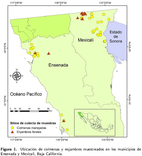 El estudio se realizó en la región noroeste del estado de Baja California, en los municipios de Ensenada y Mexicali, al norte del paralelo 30o (Figura 1), donde las condiciones climáticas favorecen la práctica de la apicultura. Los climas predominantes son árido, muy seco, cálido y con lluvias en invierno en el Valle de Mexicali, y seco mediterráneo, templado y con lluvias invernales en Ensenada (García 1988, INEGI 2001). Los apiarios se ubican en las zonas agrícolas, se muestrearon 47 colonias en el Valle de Mexicali y 34 en Ensenada. Además se incluyeron 11 enjambres silvestres capturados en Mexicali y cuatro en Ensenada. Se tomaron 30 abejas de cada colonia o enjambre y se depositaron en frascos de plástico con 150 mL de alcohol al 70 %. El montaje y análisis de las muestras se realizó en el laboratorio del Departamento de Apicultura de la Facultad de Medicina Veterinaria y Zootecnia de la Universidad Autónoma de Yucatán. Se seleccionaron al azar 10 abejas obreras de cada muestra, de cada abeja se diseccionó el ala delantera y la pata posterior derecha, las cuales se colocaron en láminas para transparencias de 24 X 36 mm. Para medir los caracteres morfométricos de las abejas se utilizó un equipo de morfometría computa-rizada con microscopio invertido y fuente de luz incorporada (Inbumex). Las transparencias se montaron con el objetivo 10x del microscopio en una tableta digitalizadora SummaSketch II Professional Plus conectada a una computadora, y se marcaron puntos en la imagen del carácter morfométrico dentro de la tableta. Estos puntos se emplearon para calcular en milímetros (mm) la longitud del ala y del fémur de cada muestra, utilizando el programa AFUSDA7 (Pérez-Castro et al. 2002).