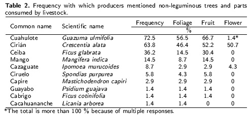The frequency with which the producers mentioned foraging trees and the parts of the trees on which the animáis feed allow them. The experience of livestock farmers, it facilitated to select the species with higher foraging potential. G. ulmifolia and C. alata are the ones that the producers report as having the highest foraging potential. Producers mentioned that the fruits are the morphological component most favored by livestock, which account for 66.7 and 52.2 % of fruits from the aforementioned trees (Table 2).