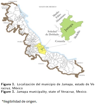 El trabajo de campo se realizó en el periodo de marzo y abril del 2009, en el municipio de Jamapa, Veracruz. El municipio se ubica en la zona centro del estado, en la región conocida como Sotavento; entre la latitud 19° 03' N y longitud 96° 14' O y a una altitud de 57 metros sobre el nivel del mar (Figura 1). Ocupa una superficie de 163.7 km2, que representa el 0.22 % del total del estado. Cuenta con 44 localidades en su territorio. Su clima es del tipo Awo (w), cálido-seco-regular, con una temperatura media anual de 25.5 °C y una precipitación media anual de 1 108 mm (INEGI 2003). El suelo es de tipo luvisol y las principales actividades desempeñadas son la agricultura y la ganadería, cuyas áreas de ocupación son 1 085 y 11 717 ha respectivamente (INEGI 2005).