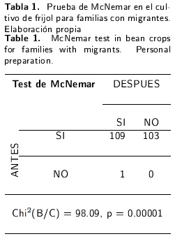 La interpretación estadística de cambio negativo general (todas las prácticas tecnológicas), lo genera la prueba de McNemar, analizando las técnicas utilizadas que antes los productores usaban en frijol y después de migrar ya no utilizaron fueron 103 y las que antes no utilizaron en frijol, pero que después sí utilizaron fue sólo una técnica (semilla mejorada) (Tabla 1).