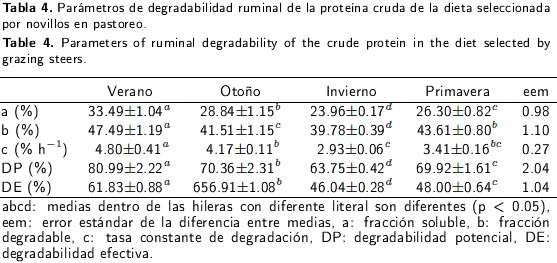 Varios trabajos reportan resultados similares a los obtenidos en este estudio en las fracciones de degradabilidad de la dieta consumida por bovinos en pastoreo y las diferencias entre estaciones del año las atribuyen al nivel de lignificación de los pastizales el cual impide el acceso de la proteasas microbianas a la proteína disponible de la dieta (Cambell y McCollum 1989, Hirschfeld et al. 1996, Foster et al. 2007). El comportamiento de la degradabilidad ruminal durante el verano es explicado en función del incremento en la fracción soluble y la tasa de degradación de la PC lo cual da como resultado el aumento en la DE de la PC (Soto-Navarro et al. 2012).
