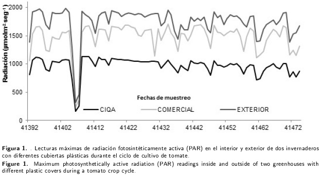 Se midió la radiación fotosintéticamente activa al interior de los invernaderos y en el exterior de los mismos y se registró utilizando sensores tipo Quantum, modelo Q16533 de la marca LI-COR, los datos fueron capturados cada minuto durante el día y la temperatura fue medida con sensores Hobos de la marca Onset, cada diez minutos durante todo el día. Los datos recolectados de ambos aparatos fueron almacenados en un data logger modelo LI-1000 de la marca LI-COR.