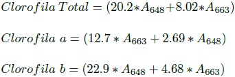 El contenido de clorofilas y carotenoides se realizó por espectrofotometría de acuerdo con las metodologías de Lichtenthaler (1987) modificada, Strickland y Parsons (1972) y Britton (1985), usando acetona al 90 % como solvente, se pesaron 0.5 g de hojas frescas y se trituraron en un mortero (frío) después se añadieron 50 ml de acetona, se filtró y del filtrado se tomó una alícuota que se colocó en una celda para espectrofotómetro, la muestra se leyó a 648 y 663 nm y para determinar el contenido de clorofila total, clorofila a y clorofila b, se usaron las siguientes fórmulas: