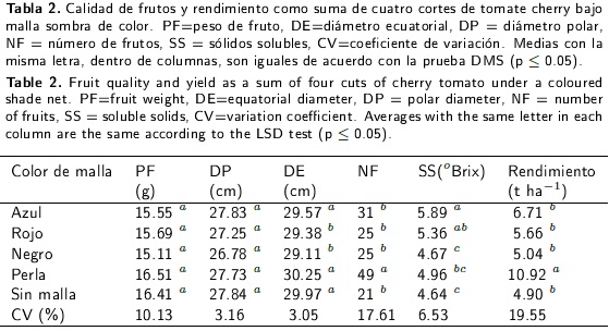 El uso de mallas sombra en la horticultura protegida es una técnica económica empleada para mejorar la radiación y evitar incrementos de temperatura. En la presente investigación se evaluó el efecto del uso de mallas sombra de cuatro colores (azul, negra, roja y perla) en la producción de tomate cherry. El rendimiento en la malla sombra de color perla se incrementó 116.66 % en comparación al rendimiento obtenido bajo la malla sombra de color negro y 122.85 % en comparación con el rendimiento obtenido en el testigo (sin malla). De acuerdo a los resultados de este estudio, la malla sombra perla se considera una alternativa viable para la producción de tomate cherry.
