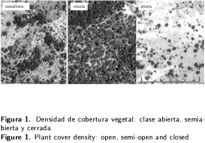 En una primera etapa se realizaron recorridos en campo para caracterizar la zona y ubicar sitios de muestreos. Como resultado se identificaron visualmente tres sitios con diferente densidad de cobertura vegetal: tipo abierta, tipo semiabierta y tipo cerrada (Figura 1). Para cada tipo de cobertura se implementaron dos transectos de 100 m2 (2 x 50 m), se tomaron medidas de altura, radio de la copa y perímetro basal de todos los individuos de más de 0.5 m de altura. Se calculó frecuencia, dominancia y densidad para luego construir el índice de Valor de Importancia (IVI), utilizado por ser un buen descriptor de la importancia de especies en un área (Curtis y Mclntosh 1951).