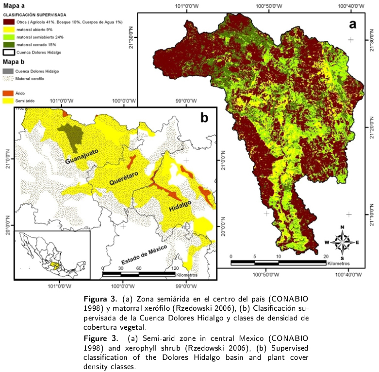A partir de la clasificación supervisada en la cuenca de Dolores Hidalgo se determinaron los siguientes usos de suelo: agrícola, cuerpos de agua, bosque y matorral xerófilo. El matorral se re-clasificó y determinaron las superficies semiabierta, cerrada y abierta con 24 000 ha, 14 000 ha y 9 000, ha respectivamente (Figura 3). Los resultados mostraron que la biomasa aérea se incrementa al aumentar la densidad de la vegetación en el orden: cobertura abierta 4.87 Mg-1, semiabierta 20.53 Mg ha-1 y cerrada 42.40 Mg ha-1. Estos resultados concuerdan con lo mencionado por Yerena-Yamallel et al. (2011) quienes encontraron que la producción de biomasa se incrementa con el gradiente geomórfologico, donde se destaca particularmente la disponibilidad hídrica, entre otros aspectos. Así mismo los reservorios de carbono (biomasa aérea*0.50) se estimaron con valores de 2.4 Mg C ha-1, 12.6 Mg C ha-1 y 21.20 Mg C ha-1 respectivamente, con un promedio de 11 Mg C ha-1. Considerando este último dato de biomasa seca y el área de cada clase de cobertura se determinó que la zona de matorral en el área de estudio contiene un total de 500 Gg C en biomasa aérea.