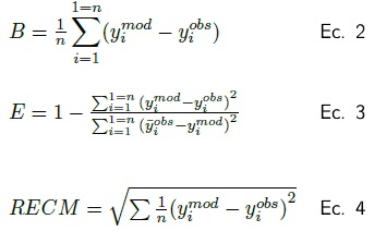 Para validar los modelos propuestos para Prosopis laevigata y Acacia farnesiana se comparó con las ecuaciones reportadas por Návar et al. (2004). La bondad de los modelos se valoró estadísticamente mediante el sesgo (B); el cual evalúa la desviación del modelo con respecto a los valores observados (Ec. 2), la eficiencia (E); que determina la capacidad de un modelo de predecir valores observados (Ec. 3) y la raíz del error cuadrático medio (RECM) (Ec. 4) que analiza la desviación de las estimaciones respecto a los valores de referencia.