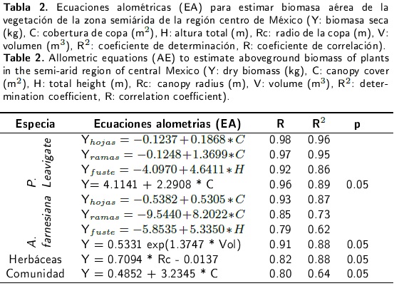 Generalmente los muestreos destructivos son difíciles y caros, especialmente en este tipo de ecosistema dada su condición de fragilidad y el alto costo que implica la destrucción de componentes tan importantes en la formación de islas de fertilidad (Geesing et al. 2000), considerando que son los únicos de tipo forestal y por tanto, los de mayor protección al suelo durante todo el año. Ante tal situación, se cortaron cinco individuos de Prosopis laevigata, Acacia farnesiana y 10 de las otras especies incluyendo pastos. Con base en los resultados de IVI y las tallas de los organismos se eligieron individuos representativos para su destrucción, registrándose su altura y diámetros de la copa. Para el caso de especies leñosas se cortaron, separaron y pesaron los compartimentos: hojas, ramas y fuste. Las muestras se secaron al aire libre hasta obtener peso constante (peso seco). Las características alométricas y el peso seco, fueron la base para construir las EA, por lo que se eligió un modelo sencillo de la forma