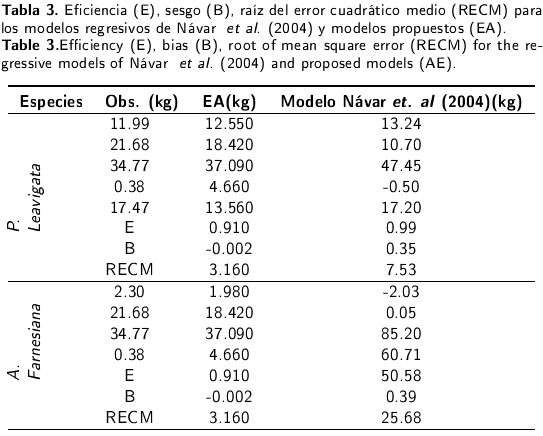 Para la validación de los modelos de Prosopis laevigata y Acacia farnesiana se compararon con las ecuaciones reportadas por Návar et al. (2004), las cuales fueron desarrolladas para el matorral Tamaulipeco localizado en la zona noroeste del país. Los valores de eficiencia resultaron óptimos en ambos modelos para Prosopis laevigata, no para el caso de Acacia farnesiana donde el modelo exponencial propuesto en este estudio resultó tener la mejor eficiencia (Tabla 3). Sin embargo, cabe destacar que los modelos con los que se compara este estudio, fueron desarrollados para una fisonomía, composición y estructura de vegetación con grandes diferencias con respecto al matorral xerófilo del centro del país, de aquí la importancia de los estudios locales (Návar 2010).