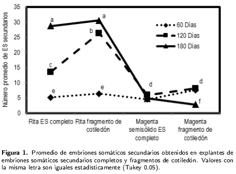 Después de los 30 d, todos los tratamientos fueron similares, mostrando escasa formación de embriones somáticos (ESO). Sin embargo, a los 120 d el tratamiento correspondiente a fragmentos de cotiledón fue estadísticamente superior al resto de los tratamientos con 26 ESO, mientras que con el tratamiento en recipiente Magenta sólo se obtuvieron ocho ESO. Al final del experimento, los cultivos en el sistema de inmersión temporal Rita® fueron estadisticamente superiores al testigo (Magenta®), en tanto que en el sitema Rita® se tuvieron 30 ESO generados con fragmentos de cotiledón y 29 ESO en cotiledones completos, produciéndose por explante en promedio tres ESO.