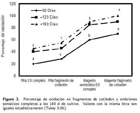 En los tratamientos, el porcentaje de oxidación incrementó con el tiempo, pero a los 180 d el sistema Rita® con embriones somaticos completos tuvo el menor porcentaje de oxidación con 45 %, mientras que el sistema Rita® con fragmentos de cotiledón presentó un 55 %, siendo estos tratamientos superiores estadísticamente a los tratamientos em medio semisolido en los recipientes Magentalos cuales tuvieron un 90 % de oxidación en embriones somáticos completos y 100 % en fragmentos de cotiledón (Figura 3).